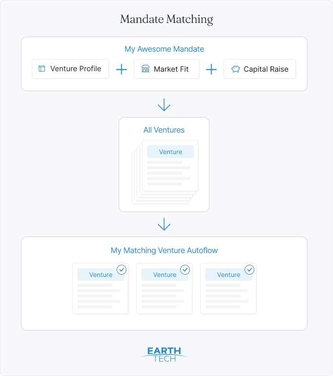 Investors: if you qualify as an Exempt Investor and you have a mandate to invest in and support impact-focused ventures to help them scale for people, planet and prosperity, you are welcome to apply to open an account as an Investor user. An individual or entity will be an Exempt Investor for the purposes of this Agreement and the Platform if they are an institutional, sophisticated, professional or wholesale investor (howsoever described under applicable securities laws) who is permitted to invest in Ventures without contravening any applicable legal or regulatory restriction and in relation to whom regulated disclosures, registration or other regulatory requirement are not required or are otherwise applicable in connection with any advice, dealing, invitation, offer or issue of securities in the jurisdiction in which they reside under all securities laws which apply to them. Investors must carefully consider whether they qualify as an Exempt Investor. EarthTech is not responsible for and does not verify whether you are an Exempt Investor. Investors must ensure that at all times while they use the Services they qualify as an Exempt Investor. Investor users may articulate their investment mandate/s within the platform and receive alerts as and when ventures who align to your mandate establish a profile or update their information, which has key revenue/ customer/ impact results. You may review the information presented by the venture, invite your investment committee into the platform to help review ventures and reach out to ventures to set up a meeting, with an agenda customisable by you. All due diligence, negotiations and completion any transactions are your responsibility. By opening an account and using the Platform or this website as an Investor, you agree and acknowledge that you are an Exempt Investor.